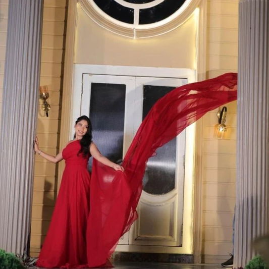 Maroon One Shoulder Pre wedding Mega Trail Gown