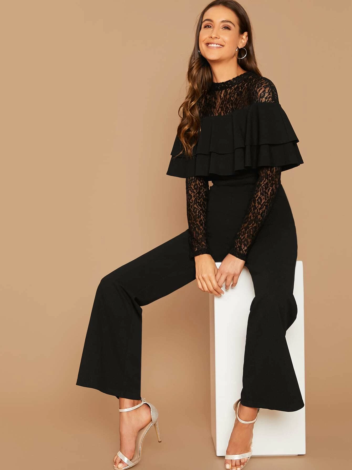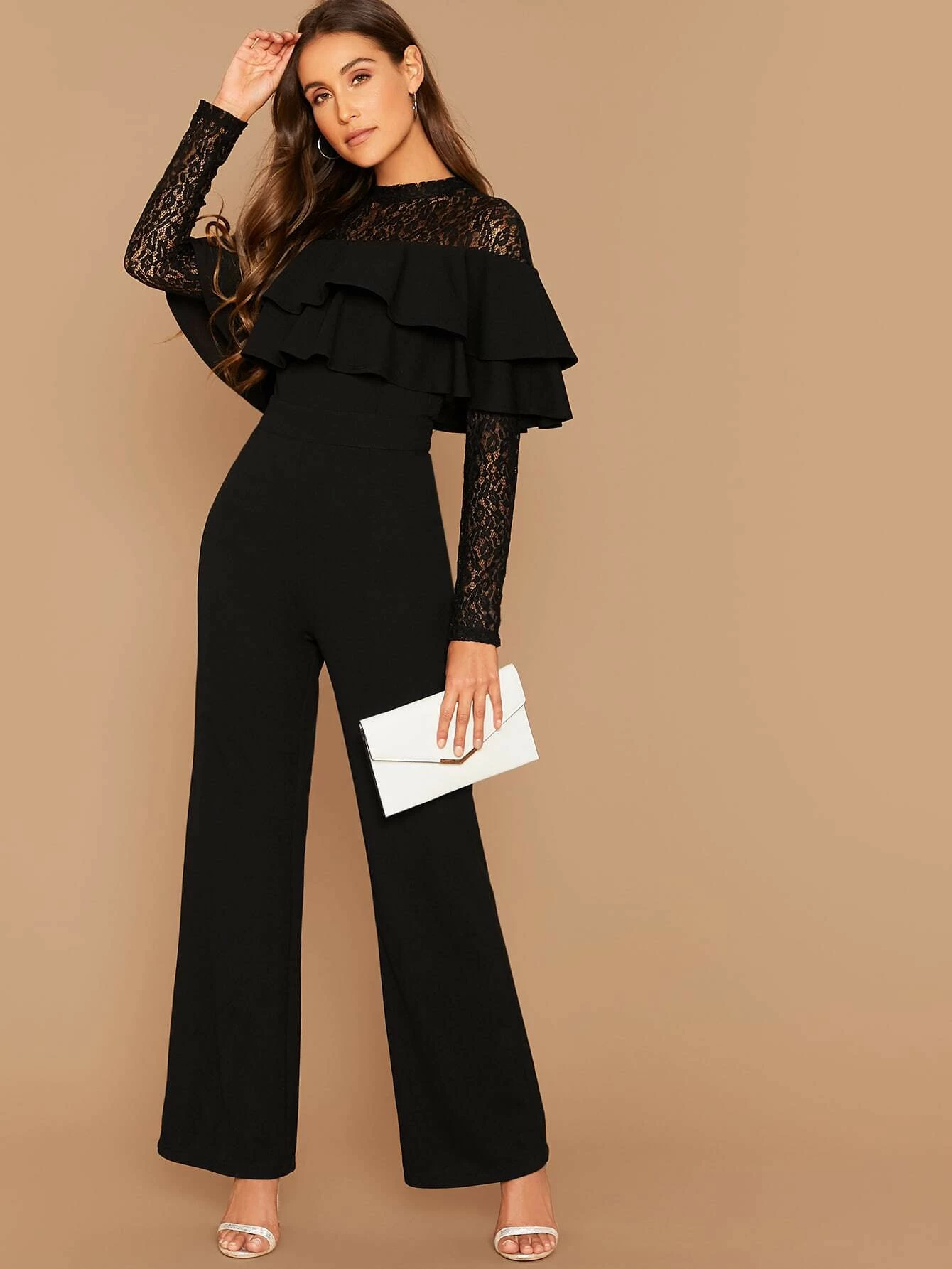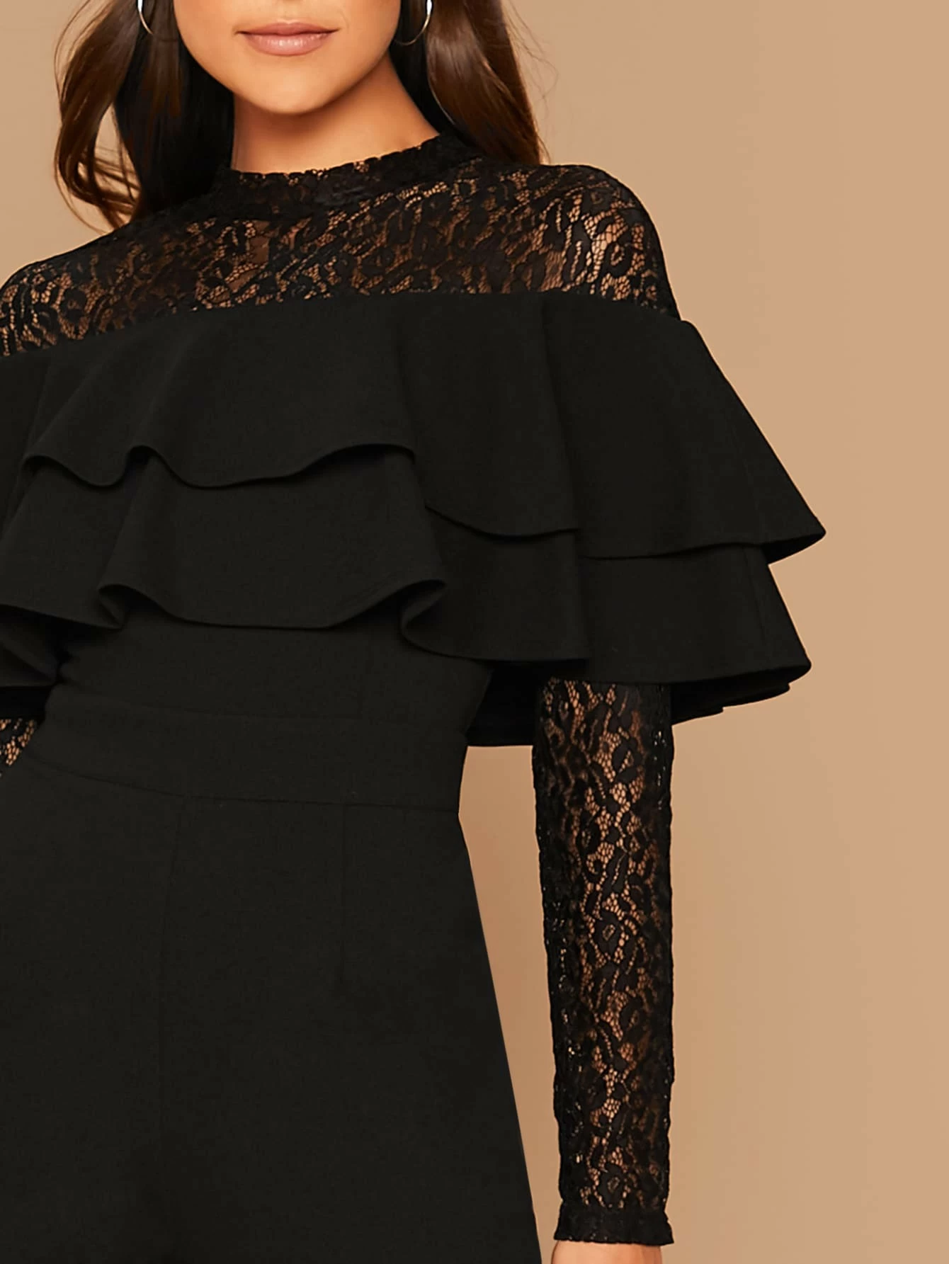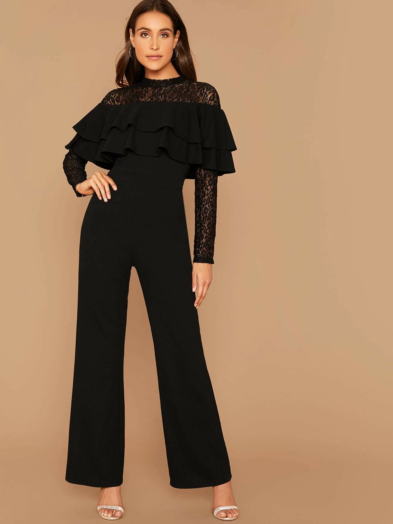 Lace Yoke Layered Flounce Wide Leg Jumpsuit