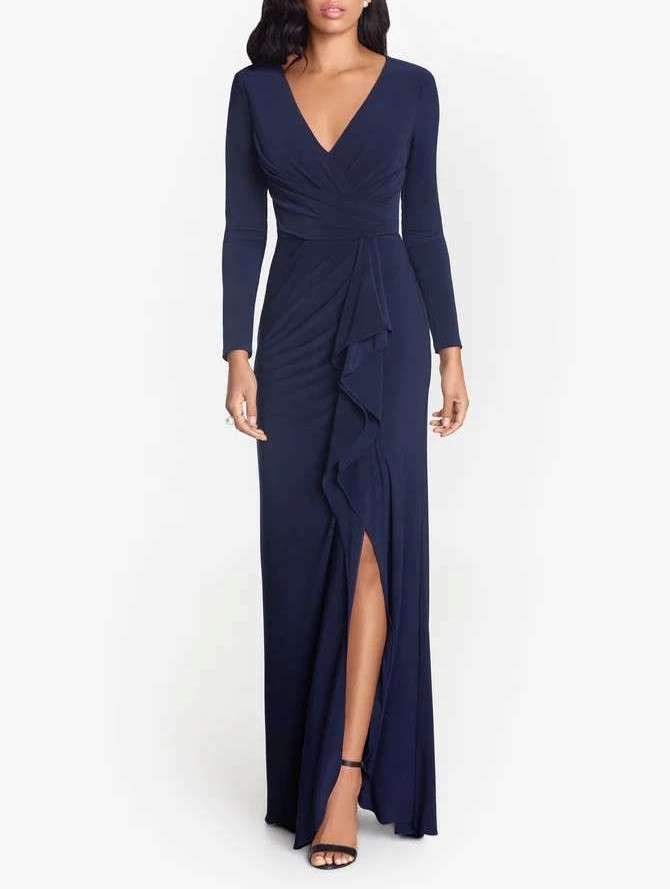 Long Sleeve Side Ruffled Slit Gown